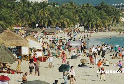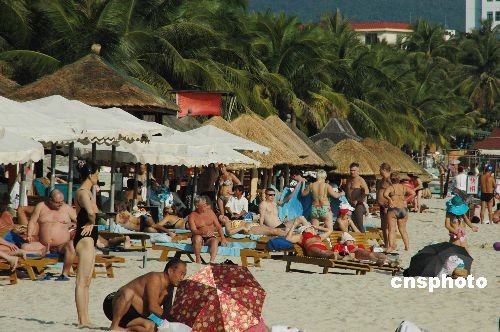 12月9日,海南三亚大东海景区,众多中外游客在海滩上晒太阳休闲。入冬以来,三亚优越的气候条件和自然美景,吸引越来越多的中外游客,旅游升温。中新社发 尹海明 摄