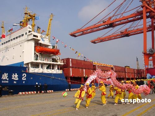 12月15日上午,厦门港4艘集装箱货轮“盛达2”轮、“锦春”轮、“晓江”轮、“华航1”轮,在人们的喝彩声中缓缓启航,直航高雄港、台中港、基隆港。从1997年4月开始获准开通对台“试点直航”、积累了10多年对台航运经验的厦门港从此升级。中新社发 杨伏山 摄