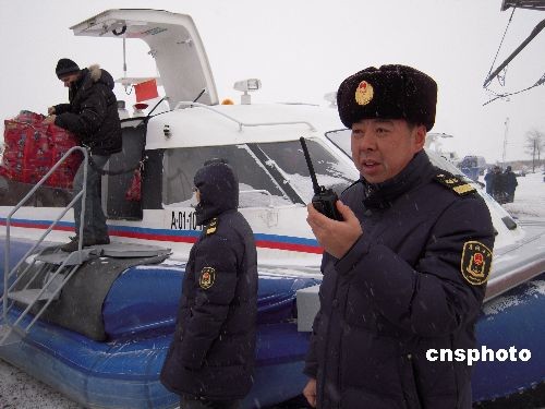 12月23日,黑河海事局执法人员在中俄界河黑龙江冒雪开展打击超载、超乘,消除交通安全隐患为内容的“两节安全大会战”。黑河海事局执法人员严格执法,使辖区连续15年未发生重大海损和人员伤亡事故,被当地群众誉为“水上平安卫士”。中新社发 邱齐龙 摄
