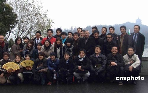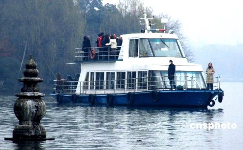 12月24日上午,日本青少年友好使者代表团一行38人搭船游览杭州西湖,在“三潭映月”合影。新田理惠小姐表示:“早就听说西湖很美,果然很让我惊喜。虽然不是晴天,但是现在的西湖让人觉得特别宁静内敛。”中新社发 周翌 摄