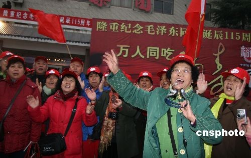 12月26日,一支来自北京的旅游团队在毛泽东家乡韶山村高歌《东方红》。当天是毛泽东诞辰115周年,人们以这种方式抒发对毛主席的敬仰和怀念之情。中新社发 邓霞 摄