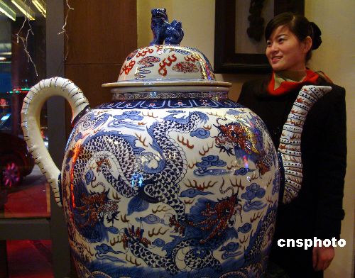 2009年1月2日,一名女士在观赏景德镇陶瓷巨壶。近日,一把可供300人同饮的景德镇陶瓷巨壶在苏州一家陶瓷商店亮相。据了解,这把陶瓷巨壶高约120厘米,壶身直径约85厘米。中新社发 王建康 摄