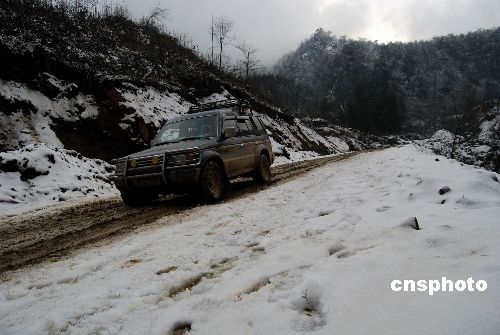 1月5日,新年伊始,四川北川迎来了2009年到第一场雪,由于大雪封山,擂禹路海拔1500米的冒火山已被冰雪吞没,维系北川关内12个羌族、藏族乡镇,6万多名群众生产生活的“生命线”再次因风雪阻断。目前,北川交通护路队进入擂禹路开始抢通,预计10日能够抢通。中新社发 胥辉 摄