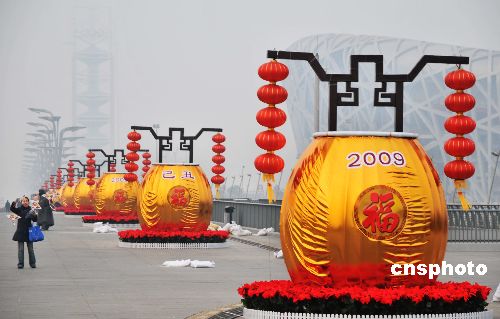 2009年1月21日,北京奥林匹克公园中轴线两侧安置的众多巨型落地灯笼为即将到来的牛年春节增添了浓浓的喜庆气氛,也吸引了众多游客拍照留念。中新社发 樊甲山 摄