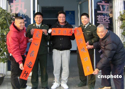 1月21日,福建宁德霞浦县三沙港的台胞代表们将一副写有“真情暖口岸,爱心在边防”的对联,送到三沙边防派出所民警手中。中新社发 郑长灵 摄