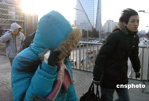 2009年1月22日,在京城东三环的跨线桥上,行人冒着寒风赶路。此前北京市气象台第二次发布寒潮蓝色预警,北京市将刮起4到5级北风,最高温降幅将达到10℃左右,周五凌晨平原地区最低气温将降至-14℃。中新社发 马毅行 摄