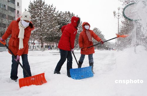 1月22日,大雪过后,新疆博乐市市民们正在清扫积雪。大寒节过后,新疆天山以北部分地区连续两日降雪,其中北部山区降大雪,局部地区降雪达到10公分左右,有效地缓解当地草场旱情和预防了农区病虫害、病菌的发生。中新社发 杜伟 摄