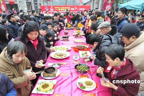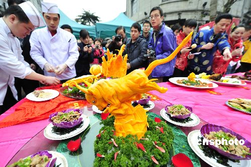 1月29日,杭州清河坊历史街区举办“全牛宴”展评活动,街区内十余家老字号餐饮业名店推出与“牛”有关的各式创新菜肴,由现场市民百姓品尝并评选出“最牛”菜肴,展示老字号企业以创新创意迎牛年牛市的自信姿态。 中新社发 李忠 摄