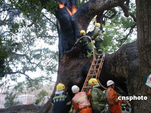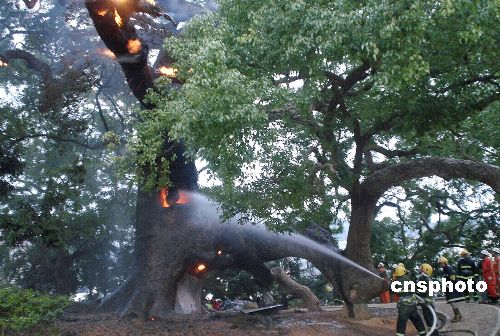 2月2日清晨,广西玉林市容县十里乡一棵350多岁的樟树着火,大火在古树内部燃烧异常猛烈。容县消防大队经过2个多小时的扑救才将大火扑灭,成功保住古树。此棵樟树胸径达231厘米,冠幅直径30米,树高25米,距今已有350多年的历史,属国家二级古树。中新社发 李鑫 摄