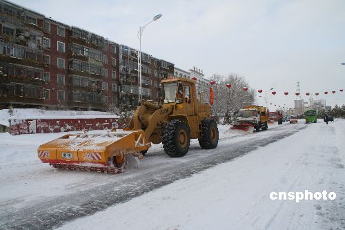 2月3日,新疆阿勒泰市建设局和地区养路段及时出动大型铲雪设备清理城市道路。自1月27日以来阿勒泰地区遭遇持续降雪天气。中新社发 唐晓波 摄