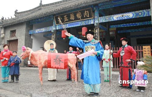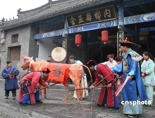 2月4日是立春节气,在河南内乡县衙,身着清代服装的工作人员,在表演“打春牛”节目。中新社发 张中立 摄
