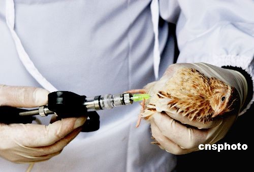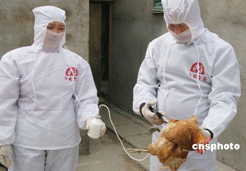 2009年2月4日,江苏省赣榆县金山镇兽医站工作人员在给鸡注射禽流感疫苗。针对当前动物防疫出现新情况,江苏省赣榆县禽牧兽医站加强对家禽的强制免疫工作,实行逐户逐只拉网式强制免疫,禽流感免疫率达100%。中新社发 司伟 摄