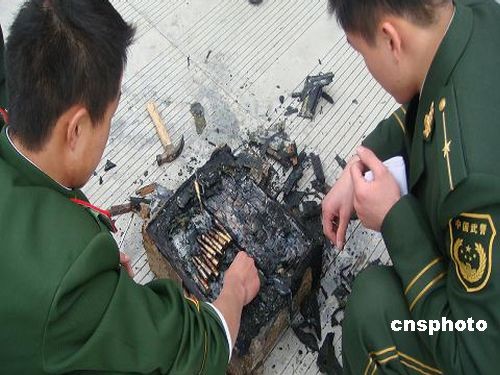 2月11日,浙江省苍南县炎亭边防派出所民警下乡走访时,遇见渔民陈某正在家门口用榔头敲打一个表面裹满了泥沙的木箱子,打开后发现有1000余发军用子弹。据边防民警介绍,这箱子弹保存较为完好,大约战争年代遗留下来,是渔民陈某在2月10日出海作业时从海底打捞上来的,误当作稀有“古董”运回家中收藏。目前,警方已依法对这箱子弹进行了收缴。中新社发 吴水斌 摄