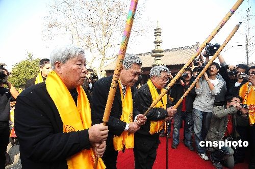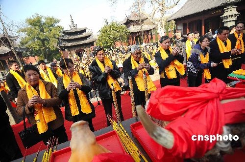 2月12日,四百余名来自海内外的钱王后裔齐聚杭州钱王祠,参加杭州传统活动——“元宵祭钱王”。整个祭祀仪式包括供放祭品、击鼓撞钟、敬香、恭读祭文、恭读《钱氏家训》、行礼等9个环节。 中新社发 引炜 摄