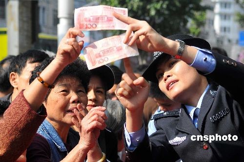 2月12日,广西梧州市金融、公安、工商部门联合在市区开展反假币宣传活动,专家们一一为市民群众揭开真、假钞票的区别,教授辨别真、假钞票的技巧。中新社发 何鎏 摄