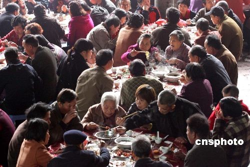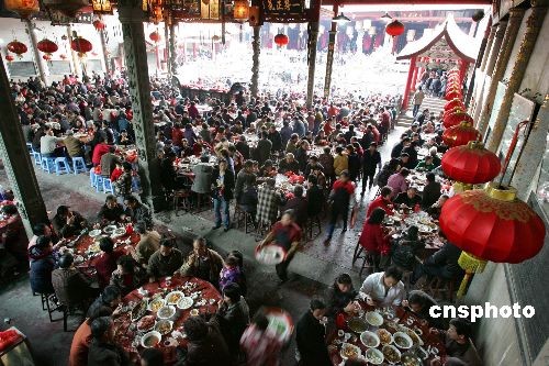 二月二十三日农历正月二十九,是福州传统的敬老节日“拗九节”,福州仓山区城门镇胪雷村陈氏祠堂里摆起千人“孝顺宴”。祠堂里里外外放置一百九十多张桌子,近二千位年过半百的老人安坐席上,欣赏戏台上演员闽剧片断的精彩表演,而村里年轻人则忙里忙外,端菜送茶。中新社发 杨婀娜 摄