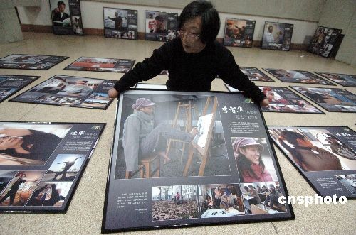 2月22日,“无手摄影师”郑龙华正在浙江展览馆布展。两天后,他拍摄的“中国100位残疾人精英摄影展”将在此开幕。郑龙华幼年失去双手,80年代初他开始自学摄影,并创作了大量作品。从2006年5月开始,他深入全国102个县,历经759个工作日,行程6万余公里,采访了全国各地各行业100位残疾人精英。中新社发 施健学 摄