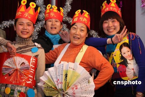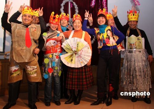 2月27日,老师在生日聚会上展示用废旧物品制作的“服装”和“生日帽”。当日,山东枣庄市君山路小学为二月份出生的13名老师举办了一场生日聚会。13名过生日的老师用报纸、挂历、包装袋等废旧物品,为自己制作了别致的“服装”和“生日帽”,在生日聚会上,向大家倡导生态环保理念。中新社发 吉 喆 摄