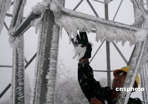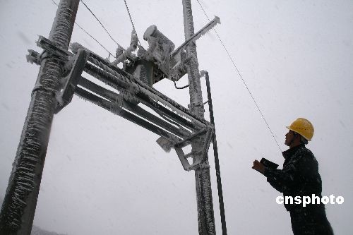 3月1日,龙山县电力总公司员工们在洛塔乡阿亏村检查变压器覆冰情况,现场除去覆冰,确保电力设施安全。连日来的低温及冷空气作用下,湖南省湘西土家族苗族自治州龙山县出现雨雪天气,给山区交通、电力、通信设施带来一定影响。中新社发 唐荣沛 摄