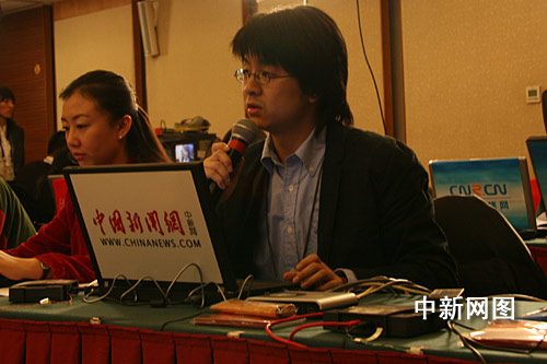 3月5日晚8时,“两会”新闻中心邀请了5位出席十一届全国人大二次会议的代表,与网民在线交流如何应对国际金融危机的挑战。图为中新网记者代表网友向5位代表提问。中新网记者 吴博 摄