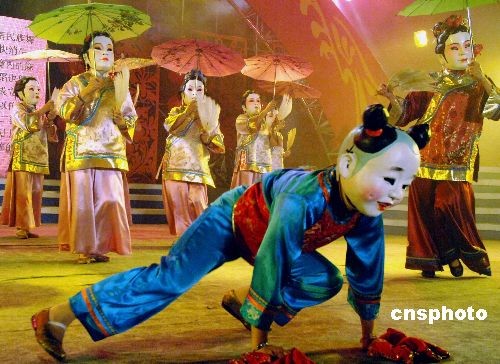 三月八日晚,台南南势社区发展协会民俗艺术家冒雨表演舞蹈《十二婆姐阵》,博得福州观众的喝彩,将海峡传统文化系列活动暨第二届(福州)陈靖姑文化节推向高潮。当晚,由闽台民俗艺术家联袂演出的“灵水之光——陈靖姑民俗文化展演”活动亮相福州金山榕城广场,吸引一千多名福州观众冒雨观看。中新社发 刘可耕 摄