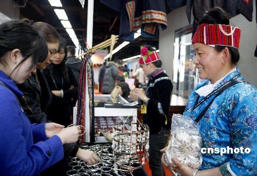 3月9日,第十九届北京国际礼品工艺品暨家用精品展会在北京国际贸易中心开幕。本届展会总面积达15000平方米,共有800多个展位,汇集了700多家参展商,适合不同人群的需求,让市民可以体验一站式采购的服务。图为贵州苗寨手工银饰品北京礼品展上受青睐。 中新社发 郑雄增 摄