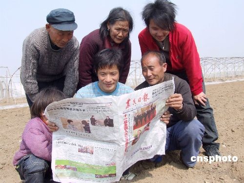 3月9日,山东省枣庄市山亭区店子镇返乡农民工张士军(右二)在农活空闲时间和村民们一起在地头学习温家宝总理作的《政府工作报告》。连日来,枣庄市山亭区人民通过电视、电脑、报纸等媒体搜索温家宝总理作的《政府工作报告》,在山亭区形成一种学习热。中新社发 王启蒙 摄