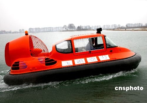 3月10日,国内首批国产气垫船在东海县成功下线后,4艘气垫船已到达黄河内蒙古段的凌讯排除第一线的冰凌区,执行“破凌”任务。 中新社发 魏爱华 摄