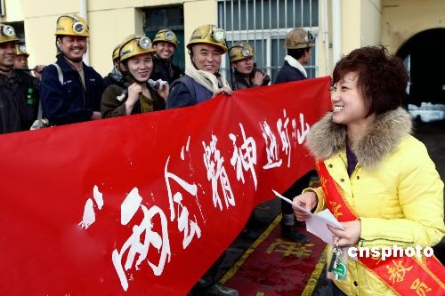 3月11日,安徽恒源煤电公司宣传员在井口给矿工宣传“两会”精神。自3月5日“两会”召开以来,安徽恒源煤电公司组织了“两会”精神在矿山宣传队,向矿工们宣传了“两会”召开的意义和“两会”上有关矿山安全生产、百姓切身利益等相关内容。中新社发 黄启军 摄