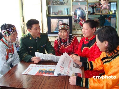 3月10日,黑龙江大兴安岭白银纳鄂伦春民族乡边防派出所官兵正在为鄂族群众读报。“两会”期间,大兴安岭白银纳鄂伦春民族乡边防派出所官兵积极向鄂伦春群众宣传两会精神,和他们一起看电视、读报纸,使他们及时了解国家的大政方针。中新社发 潘政坤 摄