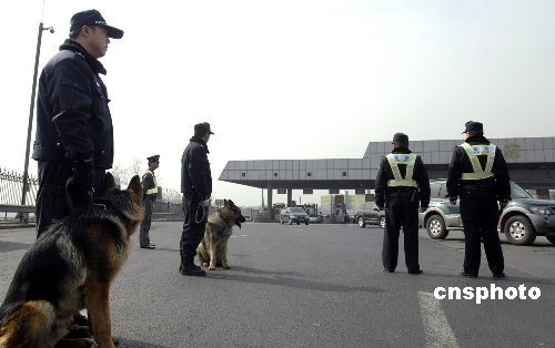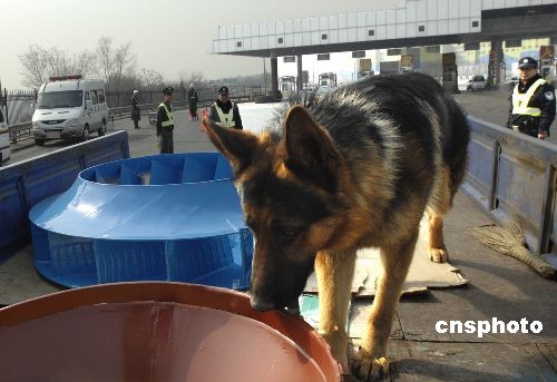 近日,北京丰台警方在京石高速公路杜家坎收费站治安检查站采取警员与警犬一同进行安全检查的措施,确保万无一失。 杜家坎收费站位于丰台西部和房山东部的交界地带,地理位置非常重要,是京石高速公路进入市区的必由之路,每天的车流量很大。中新社发 杨阳 摄
