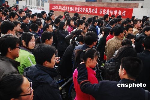 3月15日,参加山东公务员考试的考生们在山东东营市实验中学考点等待进入考场。当日,2009年度山东公务员考试公共科目笔试在全省同时举行,共有39万多人参加考试,竞争8685个岗位。中新社发 李波 摄