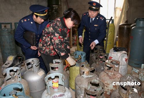 3月16日,江苏连云港工商局墟沟工商所根据群众举报在连云区栖霞西路居民区内依法取缔一处非法罐装液化气的“黑窝点”,现场共查扣大中小三种型号的液化气罐56个。中新社发 王健民 摄