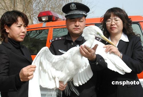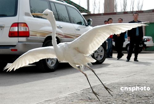 3月16日,新疆吐鲁番市公安局林业派出所,获救的白鹤。当日,吐鲁番地区移动公司员工在施工时,发现一只受伤的国家一级保护动物白鹤,随后将这只白鹤送到吐鲁番市公安局林业派出所。据了解,这只白鹤是在迁徙途中受伤患病,林业人员将对其进行治疗,待白鹤病情治愈后将它放飞。中新社发 刘健 摄