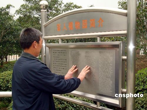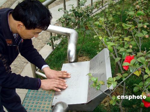 2009年3月19日,盲人在苏州盲人植物园内“手读”盲文植物介绍。阳春三月,春暖花开,一些盲人来到苏州盲人植物园踏青“赏”花。苏州盲人植物园占地面积12000多平方米,有60多种观赏植物。每种花草树木前都有盲文写的植物介绍,还配有语音辅助系统,只要盲人一触摸,就会有相应的语音服务为盲人介绍相关植物知识。中新社发 王建康 摄