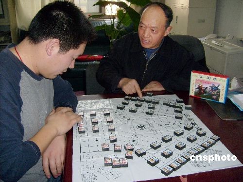 中国第二大油田胜利油田胜利采油厂离退中心的退休教师魏树爱很喜欢看《三国演义》,从上世纪九十年代开始,就开始根据中国古典名著《三国演义》设计三人对弈的三国棋,并为该棋制定了完整的对弈规则和一套棋子设置。二00八年十月八日,魏老师的这一发明专利正式被中国国家专利局授权公告。三国棋的棋盘由魏蜀吴三方和三条界河组成,三个粗线长方形是三国领土。棋子的正面由三国人物与文字组成,左边是人物,右边是职衔。一副棋共有五十七个棋子,每国十九个棋子,包括一王、一帅、四个大将、六个上将、二个侍卫、五个卒子。图为魏老师在指导学生下三国棋。中新社发 王宝平 摄