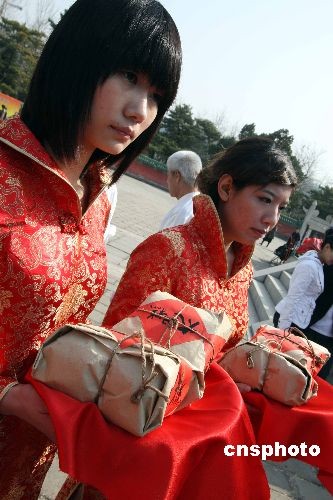 三月二十日,是中国二十四节气中的春分。北京春分朝阳民俗文化艺术节闪亮登场,为中国这一第一批非物质文化遗产的传承提供了展示的天地。北京春分朝阳民俗文化艺术节于二零零七年开始首创,直至今年已经举办了三届,由于内容丰富多彩,为百姓喜闻乐见而深受欢迎。图为现场将春分节令食品--太阳糕赠送给志愿者。中新社发 任海霞 摄