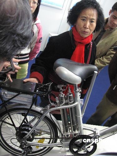 三月二十日,北京展览馆举办的“2009年中国国际节能减排与新能源博览会”上,一款采用空冷自增湿技术研制的氢“燃料电池”动力自行车颇受关注。该车价值三万元人民币,每行驶一公里消耗氢燃料成本二点五分钱人民币,是目前动力车最洁净能源之一。中新社发 邹宪 摄