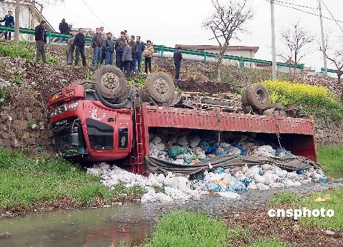 3月22日,在安徽省含山县林头镇境内,一辆满载机械铸件的大货车为避让占道的路边坑,躲闪不及滚下路边约7米深的山沟,车内一人受伤,车辆严重受损。中新社发 丰成 摄