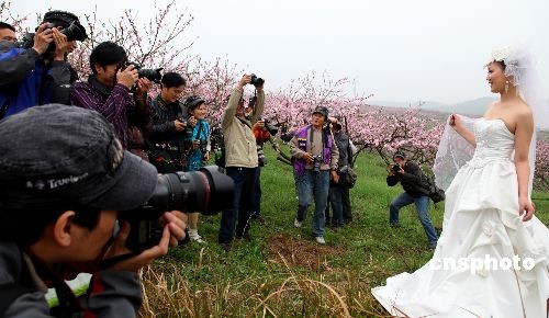 3月21日,摄影师们正在以婚纱美女为模特进行拍摄。由宜昌市摄影家协会、三峡广电新闻网及“真爱”婚纱摄影共同举办“三峡春天摄影大赛”日前在枝江万亩桃花园开赛,百余名专业摄影师及摄影爱好者以摄影会友。 中新社发 望作信 摄