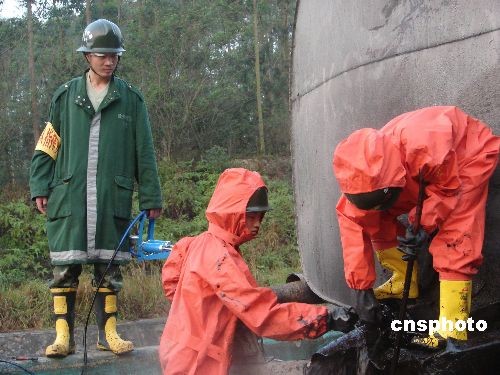 3月23日清晨,广西南北高速公路那丽出口处,一辆运载蔬菜的货车与一辆装载沥青的槽车追尾,造成货车上3人被困,槽车上大量沥青泄漏,流向当地一饮用水源江河。经过钦州消防人员3个小时的艰辛奋战,沥青终于被成功堵截,未流入河中。中新社发 田华松 摄