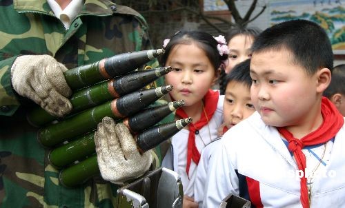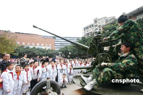 3月23日“世界气象日”当天,重庆市永川区气象局“气象知识宣讲小分队”的队员们把一门用于人工影响天气的三七高炮开进了红专小学校园进行气象知识宣传。小学生们看着从未见过的高炮,兴奋之情不溢言表。中新社发 陈仕川 摄