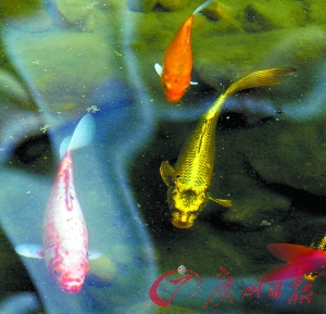 据小区管理人员讲,生活在小区花园池塘的锦鲤都是人工放养的,目前池塘鱼种有几十类,不同种群的鱼长期群居在一起,很有可能令繁衍出的鱼产生变异品种。曹菁 摄
