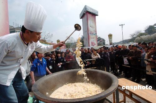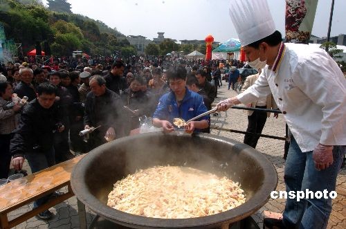 3月25日,中国竹乡临安市在杭州吴山广场上大摆“百笋宴”。笋农在现场用一口直径1.5米的大铁锅,烹煮了一锅700多斤的咸肉炖春笋,让杭州市民品尝。临安市还在现场向杭州市民发放价值100万的餐饮消费券,为临安农产品进军杭城搭桥铺路。中新社发 施健学 摄