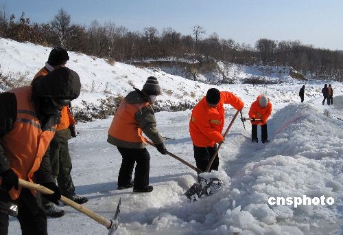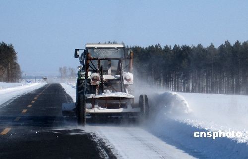 3月25日,黑河市公路管理站的大型机械在国道清理冰雪。连日来,黑河市普降大雪,黑河市公路管理站立即启动应急预案,紧急组织机械、人力、配合道班员工不分昼夜地清理路面积雪和冰湖。中新社发 邱齐龙 摄