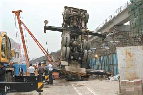 事故发生在地铁3号线施工现场,据工地上的一位工人介绍,当时这辆大型起重机正在对一辆停在路边的打桩机进行起吊,“没想到吊车刚刚吊起重物后便‘轰’地翻倒在地,而吊臂则重重地砸在公路上,并撑住了车身,之后大吊车便‘竖’在了路面上。”事故发生时,工地上有几名正在施工的工人,由于躲避及时,没有人员受伤。现场一位运政部门的工作人员说,事故原因可能是操作不当,在吊起重物的时候没有及时收吊臂,导致吊车重心不稳。