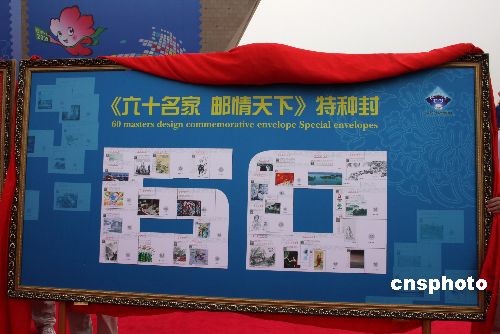 4月10日,为纪念中国2009世界邮展,中国60位著名设计家专门设计了60个纪念封。当日,国际集邮联合会理事、中国2009世界集邮展览顾问郑炳贤,河南省人民政府省长郭庚茂为60位著名设计家设计的60个纪念封揭幕。中新社发 王中举 摄