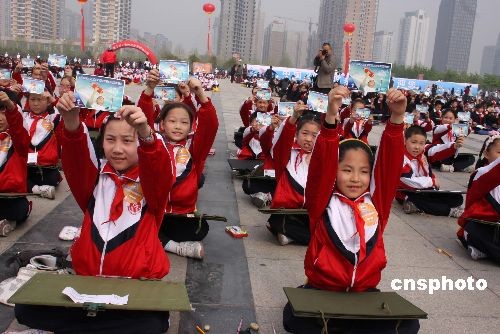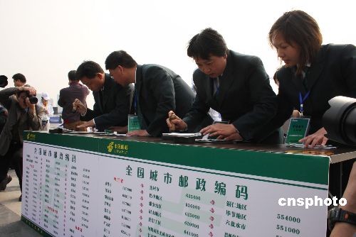4月10日,河南洛阳,由4493人参加的“同时寄发明信片活动”,创同场同时寄发明信片人数最多吉尼斯纪录。当日,邮展执委会联合洛阳市邮政局设立现场临时邮局,按一人一张分发空白明信片,要求在规定时间内当场填写,当场投递,当场加盖邮戳,并经现场认证实时寄发。这项活动的吉尼斯纪录由丹东市3316人于2008年12月25日刷新并保持至今。中新社发 王中举 摄