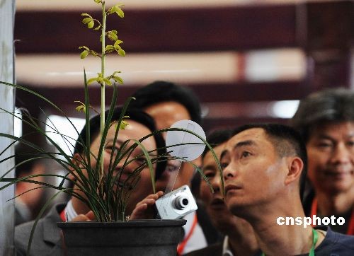 4月13日,观众正在观看价值上百万元人民币的兰花。当日,中国第二届兰文化博览会在浙江绍兴县柯桥国际会展中心开幕,江苏、浙江、云南等10多个兰花栽培大省和中国港澳台地区,以及日本、韩国、新加坡、泰国等外国兰花组织组团参加,展出各种兰花3万盆。在为期3天的兰文化博览会期间,将进行名贵兰花和兰文化展、兰花研讨和交易等。兰花是浙江省省花和绍兴市市花,首届兰文化博览会于5年前在绍兴举办。中新社发 袁云 摄