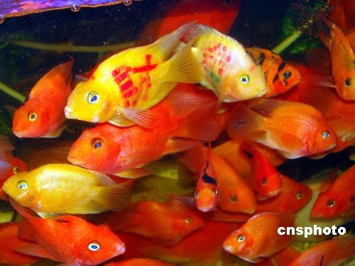 日前,杭州吴山广场“纹身鱼”火爆热卖,鱼身上分别纹上了“生”、“意”、“兴”、“隆”、“恭”、“喜”、“发”、“财”的汉字,据商家介绍,刚引进的时候每只只卖20多元,现在卖到100元一只,380元四只的价格,仍然供不应求,杭州市民对这种鱼似乎格外的喜欢,让商家也很意外。中新社发 王磊 摄
